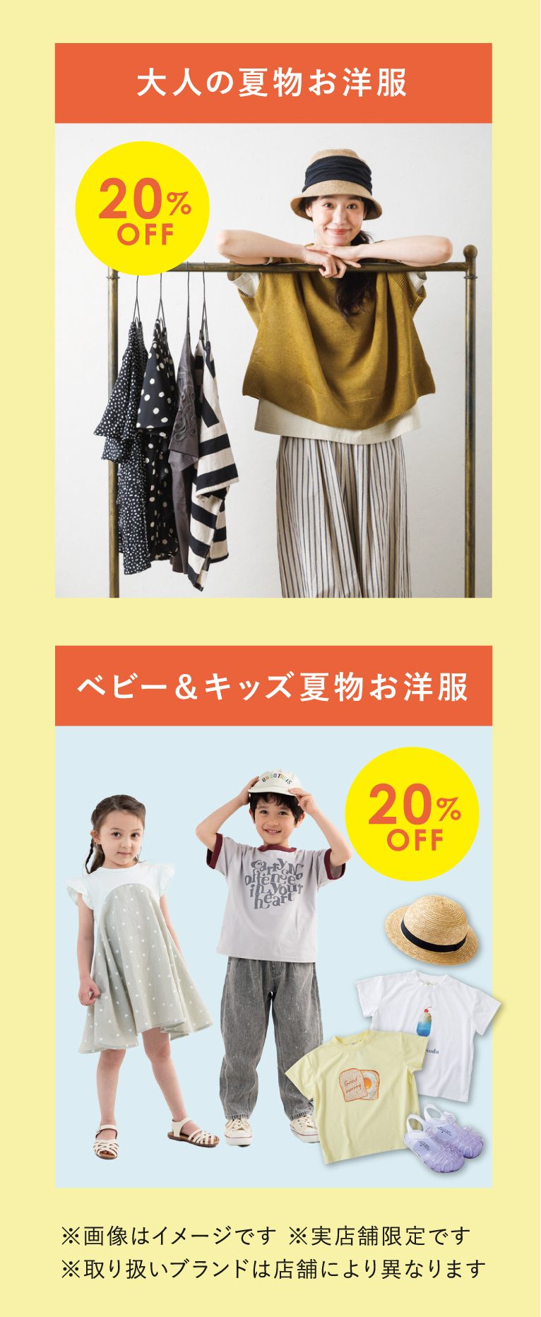7/4(金)より、全てのお客様対象のサマーセールがスタート!夏物ファッションアイテムやベビー&キッズ夏物お洋服が20%OFF!