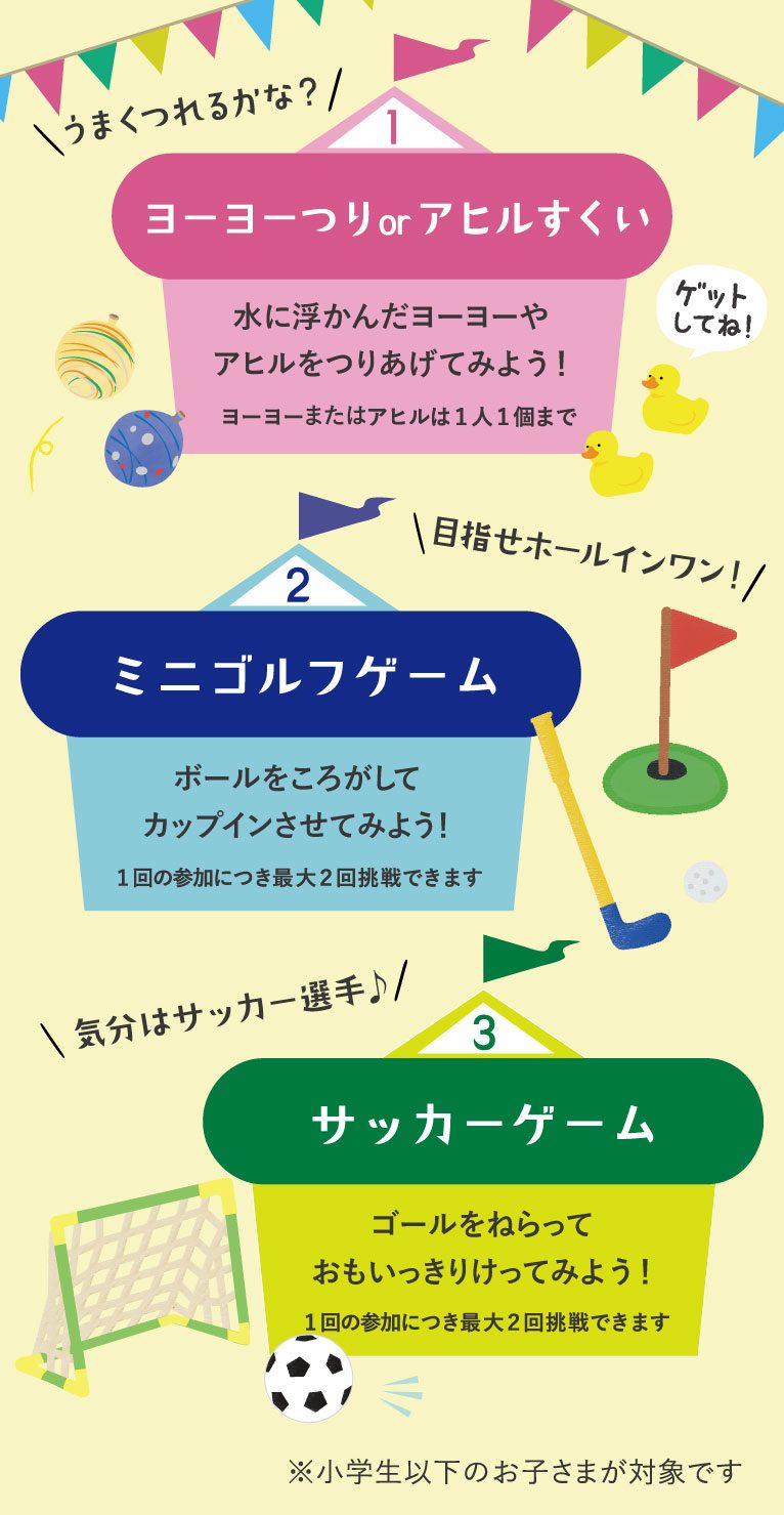 楽しいゲームは「ヨーヨーつりorアヒルすくい」「ミニゴルフゲーム」「サッカーゲーム」の3種類!