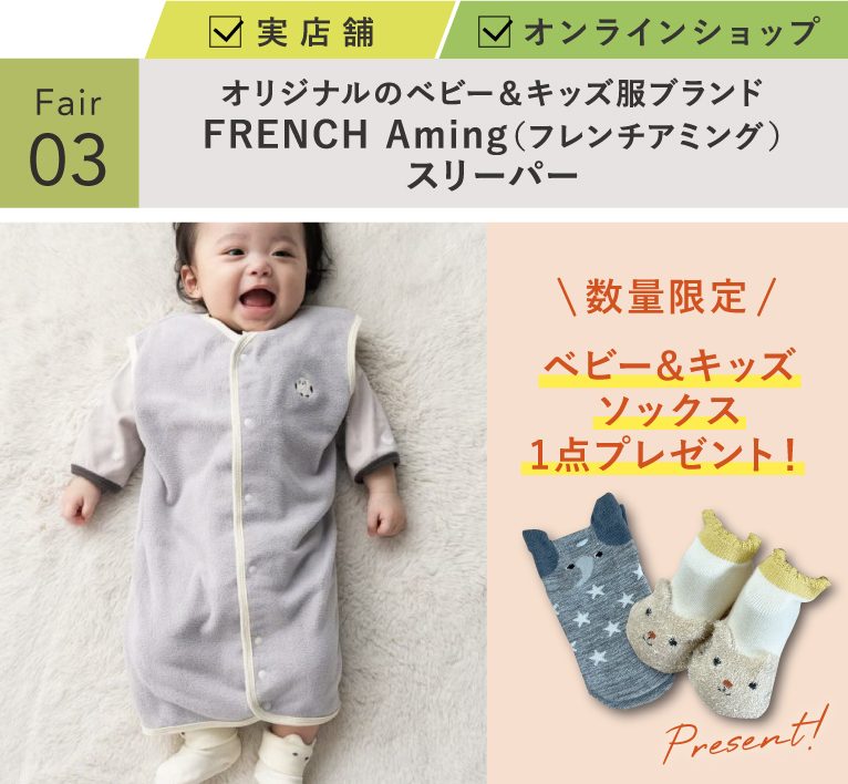 9月は「FRENCH Aming(フレンチアミング) スリーパー」を1点以上ご購入で「ベビー&キッズソックス」を1点プレゼント!