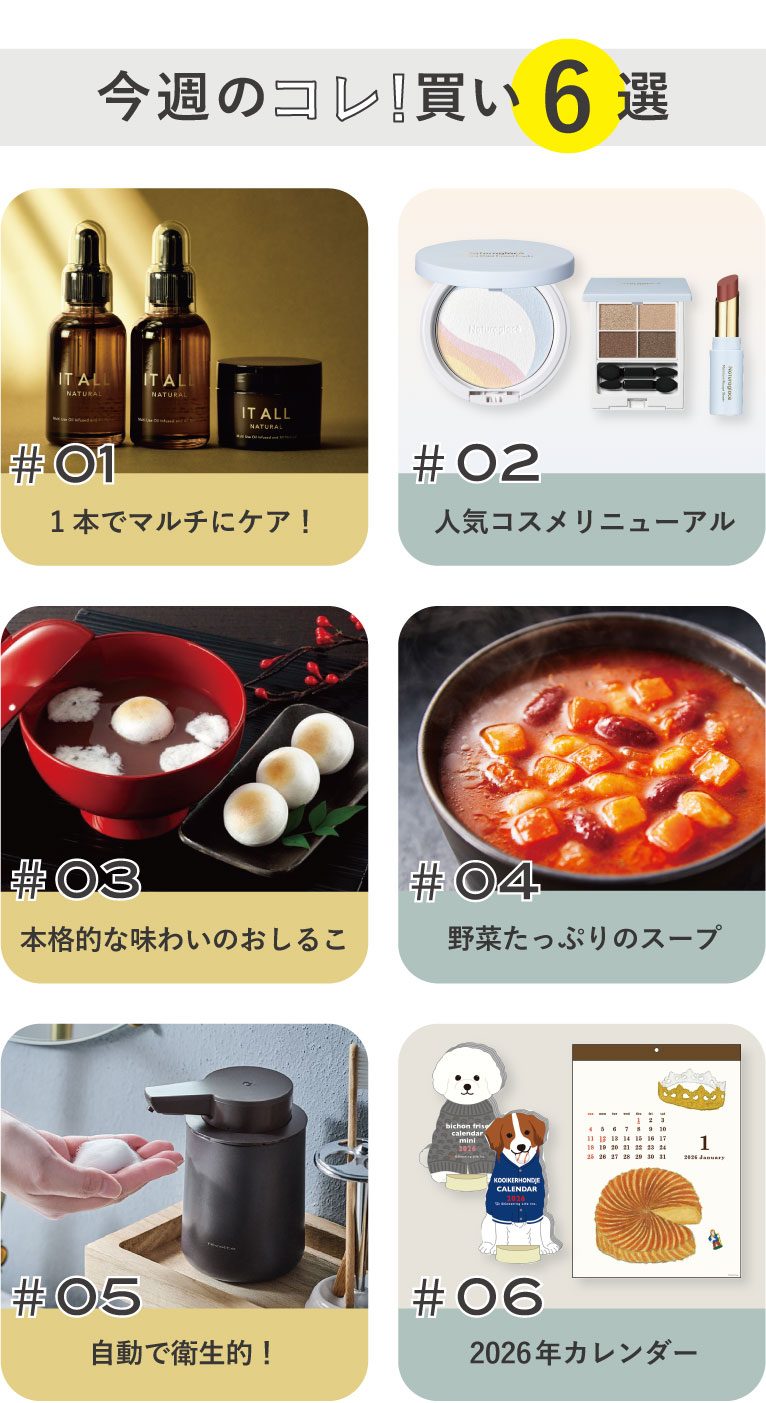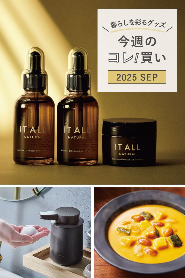 ちょっと気分が上がる、暮らしを彩るアイテムが届きました!乾燥が気になる季節にうれしい「IT ALL NATURAL」のマルチオイルや手をかざすだけで衛生的に使える「充電式オートディスペンサー」、手軽に本格的な味わいが楽しめる「ニシキヤキッチン」のスープなど!