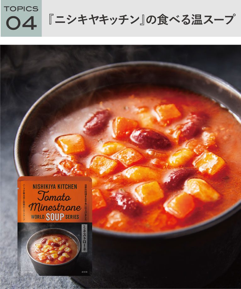 忙しい日やちょっと小腹がすいたときにぴったり!『ニシキヤキッチン』の食べるスープが今年も登場しました。手軽に本格的な味わいが楽しめるのはもちろん、野菜たっぷりで体にもうれしい人気シリーズ。慌ただしい毎日でも、時間をかけずにホッとできる食事をサポートします♪