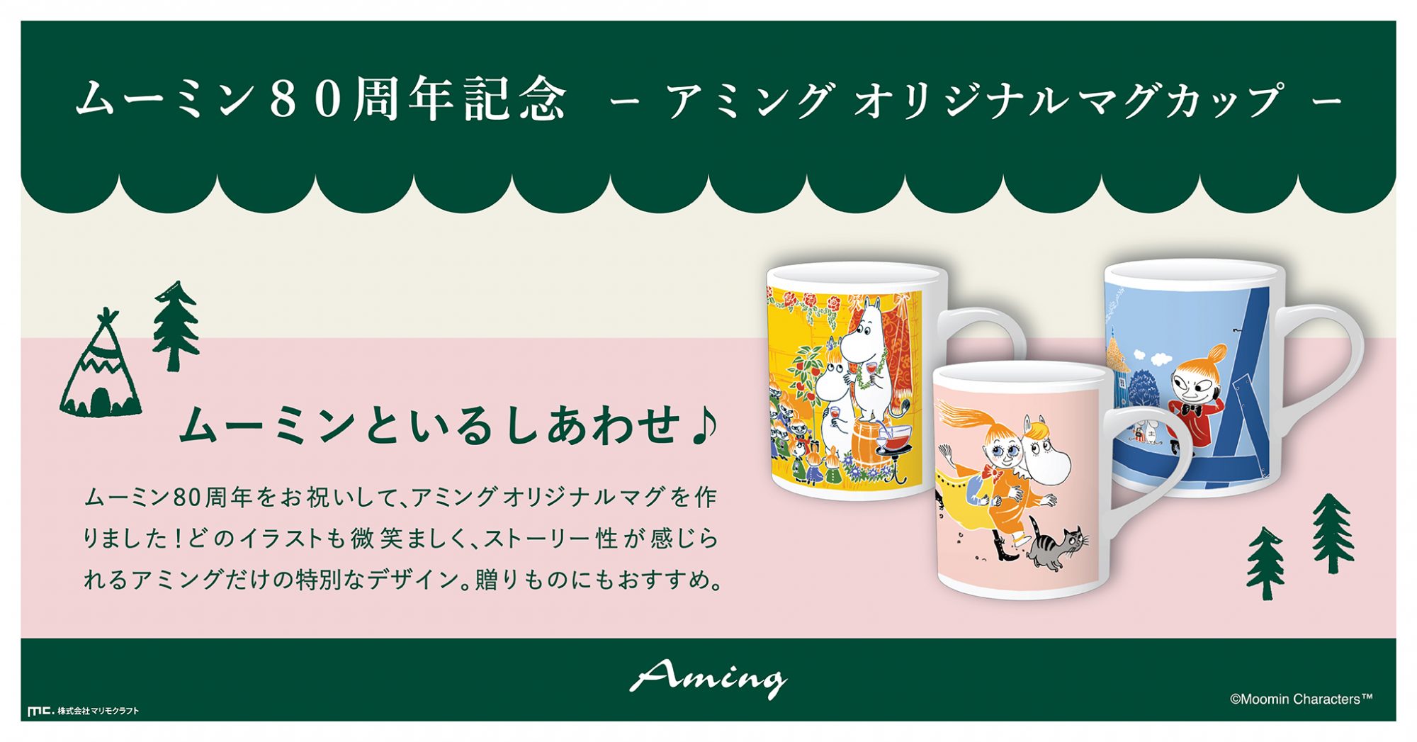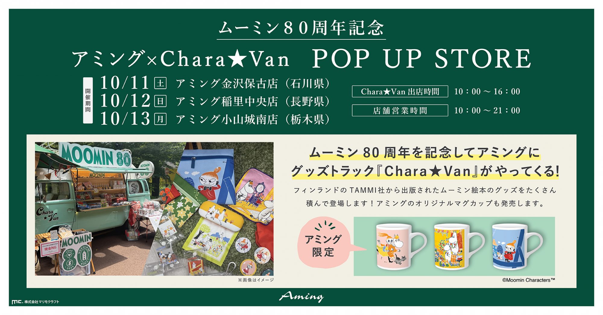 大人気キャラクター『ムーミン』のグッズをたくさん積んで登場!ここでしか買えない、アミング限定デザインのオリジナルマグカップもご用意しております。