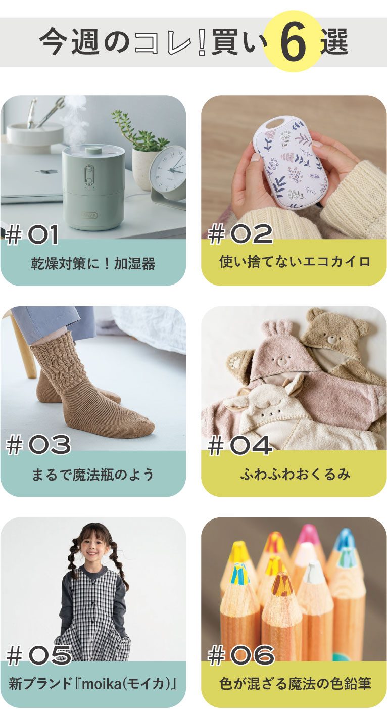 アミングオリジナルの子ども服の新ブランド『moika(モイカ)』やお部屋に馴染むおしゃれな加湿器など、毎日の時間をより快適にしてくれるアイテムが登場♪