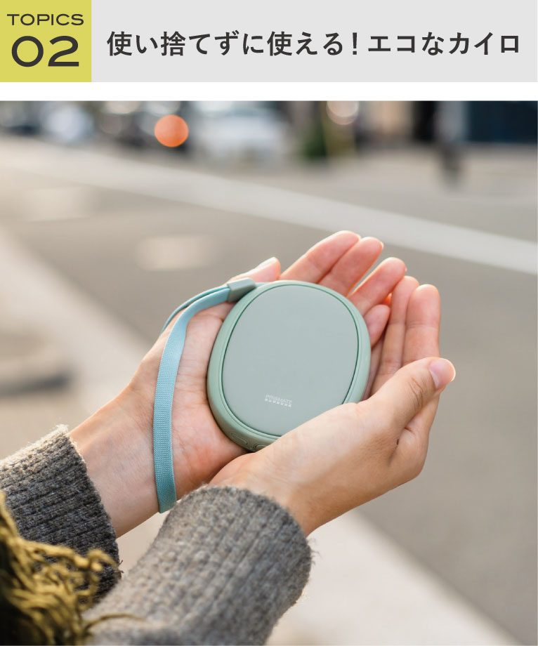 エコでかわいい使い捨てない充電式のカイロ。使いやすさにこだわり、手のひらサイズで薄型なのもポイント。設定温度はおよそ45〜50度(※)でしっかりあたたかいのに、わずか数秒で温まります。充電式なので何度も繰り返し使用可能です。