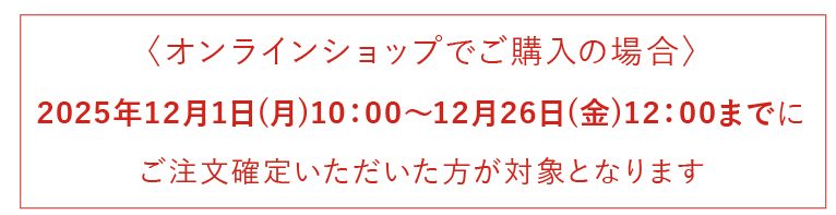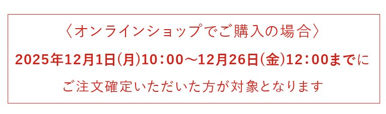 【オンラインショップ開催期間】2025年12月1日(月)10:00~12月26日(金)12:00までにご注文確定いただいた方が対象※ご指定いただいたお届け先がご注文者様の住所と異なる場合、プレゼントフェアは対象外となります。またプレゼントのみの別送は対応しておりませんのでご了承ください
